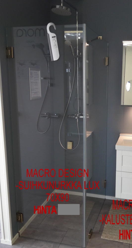 Poistohintaan Macro Design Lux -suihkunurkka 70x90. Kullanvärisin heloin.