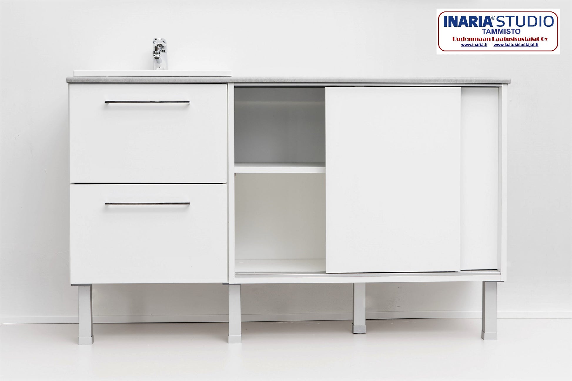 Inaria -allaskaappi liukuovilla ja laatikoilla. pit. 150cm, valkoinen. Vaalea tammilaminaattitaso