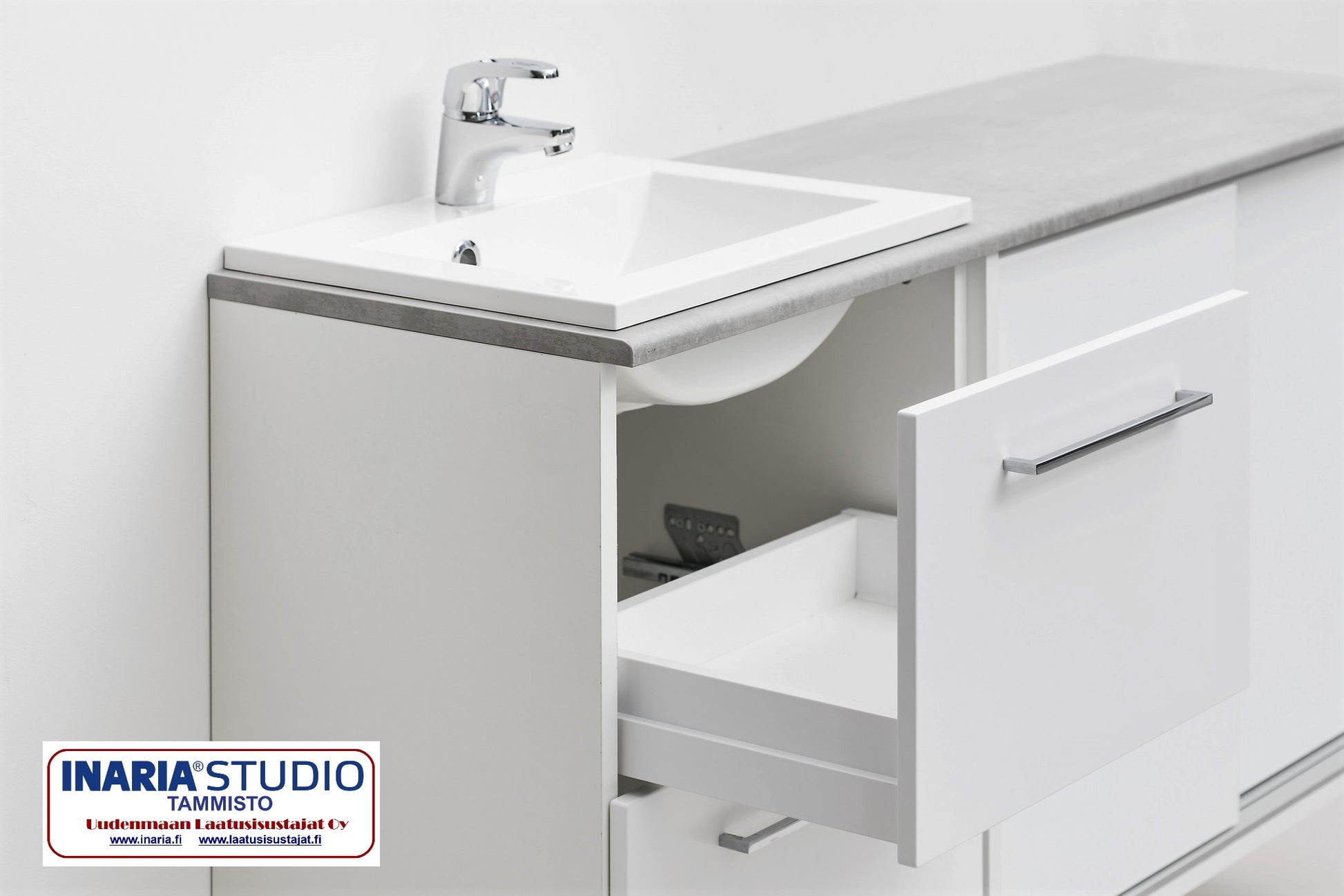 Tyylikäs Inaria-allaskaappi liukuovilla ja laatikoilla. Laatikoiden leveys 50cm ja liukuovikaapin osuus 100cm. Liukuovissa laadukkaat softclose- liukumekanismit. Reunahiottu valkoinen mattalasi. Laminaattitaso vaaleatammi. Allas valumarmoria lev. 500mm sis. pohjaventiilin ja poistoputken. Säädettävät säädettävät alumiiniset tukijalat. Vetimet kromatut metallia 26cm.